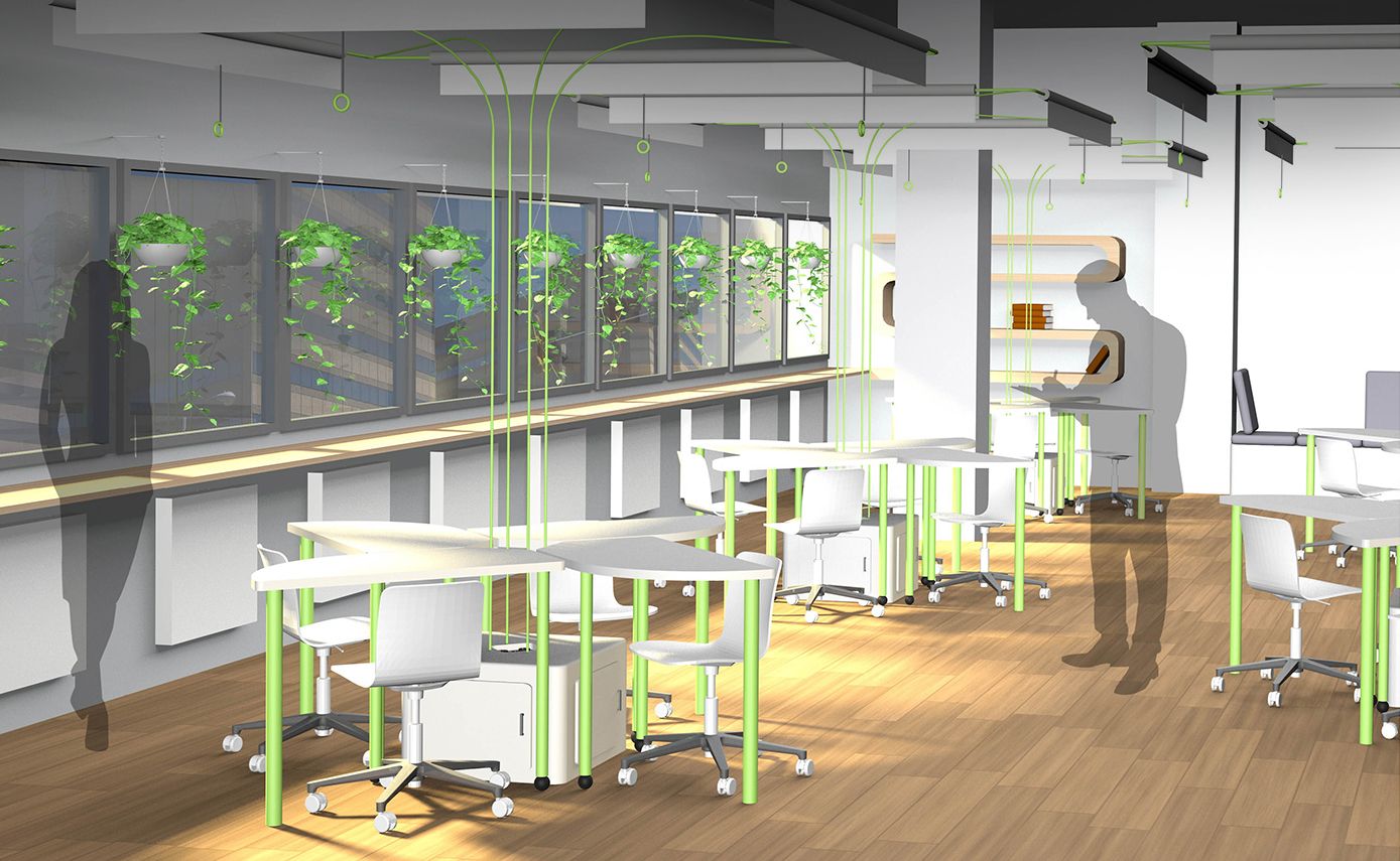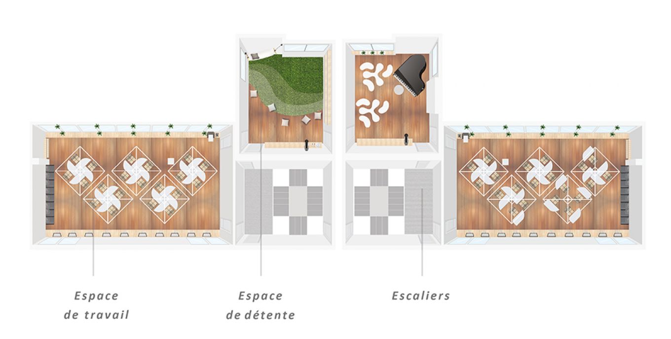 Aménagement de deux étages de coworking pour la Société du Grand Paris en région parisienne. Lors de cette semaine de workshop, avec mon équipe de 4 personnes, nous avons élaboré une proposition d’aménagement de ces bureaux. Notre objectif : un lieu où le naturel et le bien-être devaient être au rendez-vous, tout comme la possibilité de s’isoler et de travailler efficacement.