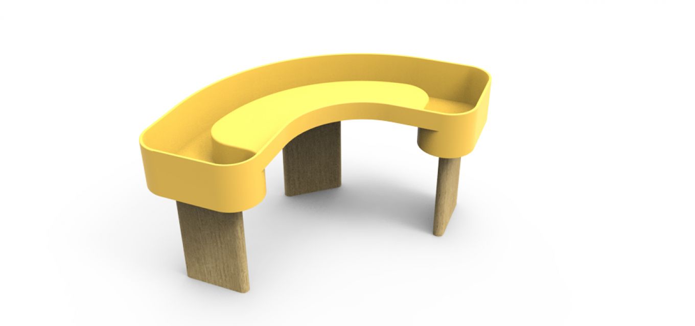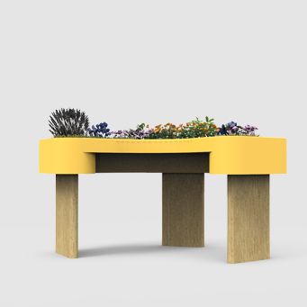 Chaque jardinière de cette gamme est conçue en fonctions des différents besoins et attentes des “jardiniers”, ceci dans une logique non-stigmatisante et idéale pour tous. Le Croissant (jardinière jaune) est à destination des jardiniers à mobilité réduite, se déplaçant en fauteuil roulant. La forme du croissant vient épouser l’arc de cercle que le bras peut effectuer.