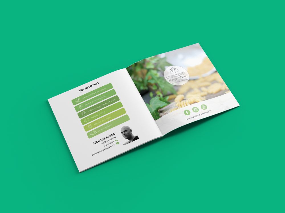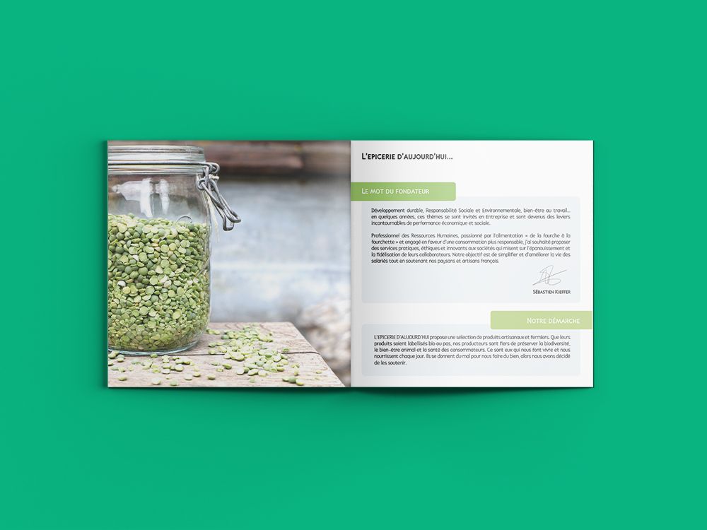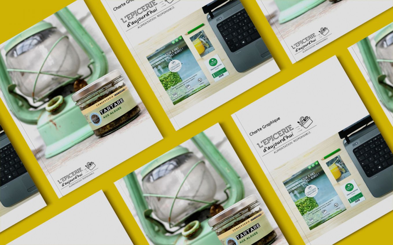 Etablissement de l'identité graphique de l'Epicerie d'Aujourd'hui à partir de son logo. Réalisation de la charte graphique et des supports de communication à destination des professionnels et des entreprises.