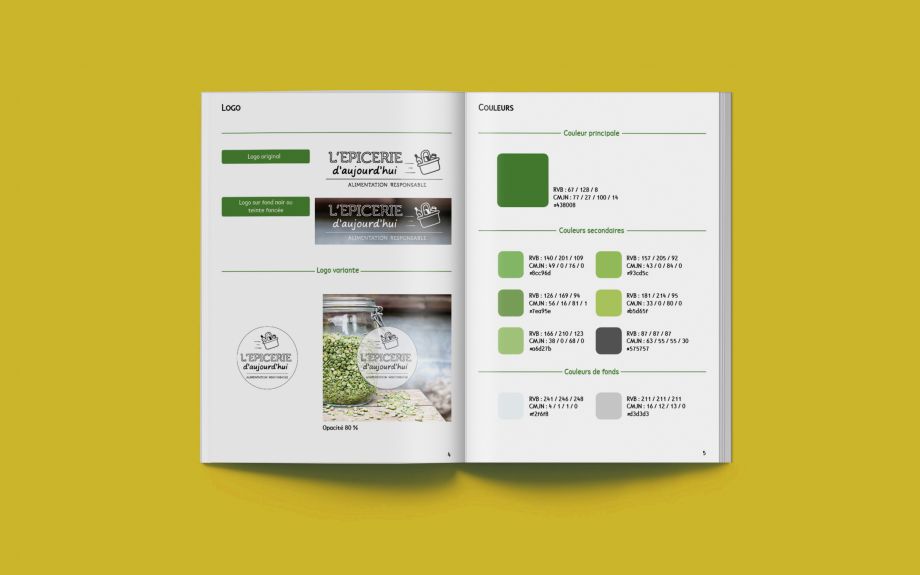 L'épicerie d'aujourd'hui vendant des produits locaux, responsables, avec peu d'emballages plastique, l'idée de rester sur des teintes naturelles et un camaïeu de verts s'est rapidement imposée. Ainsi on retrouve plusieurs verts dans cette charte, avec quelques gris. Les photos des produits viennent régulièrement soutenir le logo et les supports de communication.